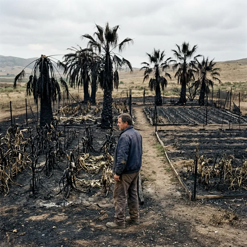 An image of a man gazing at two gardens where all crops and palm trees have been destroyed and charred.