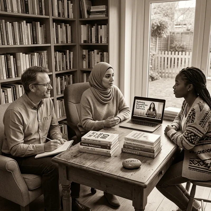 A sepia-toned image depicting the concept of developing healthy boundaries. The scene might include a person sitting in a comfortable workspace, perhaps at a desk laden with self-help books and a laptop displaying a video blog. Include representation of diverse individuals, such as a Caucasian man, a Black woman, and a Middle-Eastern individual all partaking in a calming conversation about self boundaries. Subtle symbols of boundary-setting may be interspersed, such as fences or boundary stones. Ensure an overall atmosphere of respect and healthy conversation.
