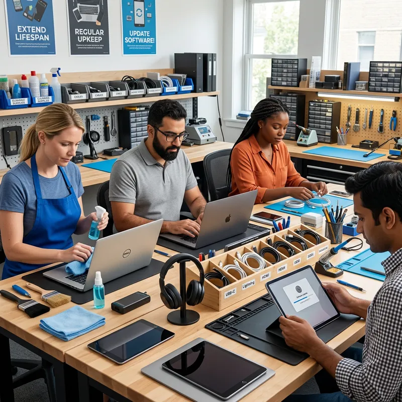 Illustrate a scene depicting the proper care and maintenance of electronic devices. Include a workbench with several electronics like laptops, tablets, smartphones, and headphones that are being taken care of. Show a person with a Caucasian descent and female gender, meticulously cleaning the screens with a microfiber cloth. Another Middle-Eastern male is defragmenting a hard drive on a laptop. A Black female is carefully organizing cables and chargers in a separate compartment. A South Asian male is updating software on a tablet. The whole environment must stress the importance of regular upkeep for prolonging the lifespan of devices.