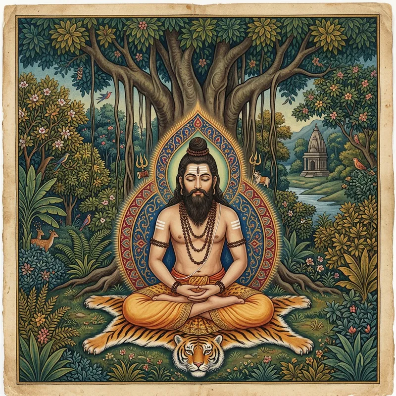 A devoted follower of Lord Shiva, depicted in the style of utilizing vibrant colors and intricate patterns reminiscent of the Indian art dated prior 1912, meditating in a tranquil forest. This scene captures the divine energy emitting from the follower, showing his connection to his faith. The image takes up a portrait composition and gives the feeling as if it was captured with a high-resolution camera with deep focus. It truly encapsulates the essence of a spiritual masterpiece.