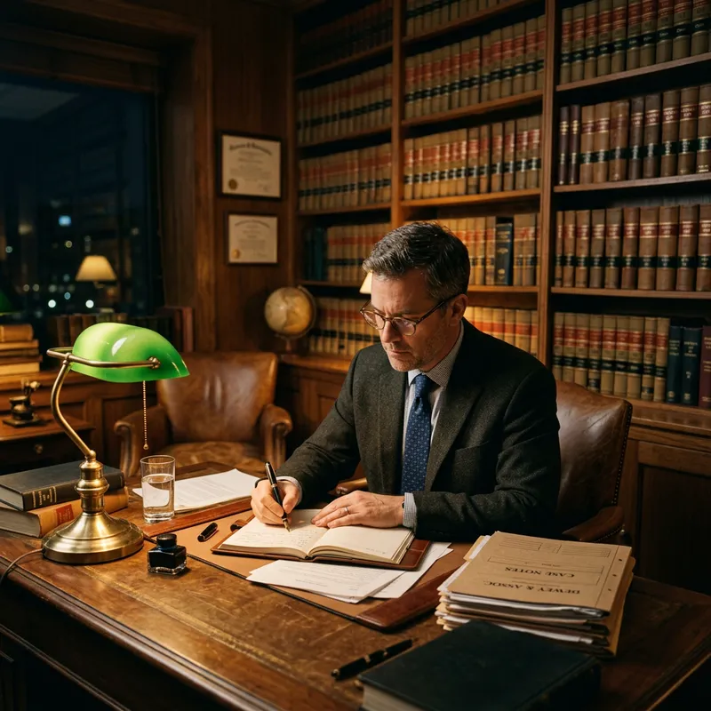 Dewey, a professional man wearing glasses and business attire, sitting at his wooden desk in a vintage office, working late at night under the warm glow of a classic desk lamp. He is focused on writing a document with a pen, papers scattered on his desk. The lamp illuminates his workspace with golden light. Detailed office setting with bookshelves in the background, law books, and a cozy professional atmosphere. Cinematic lighting, realistic style, warm tones.