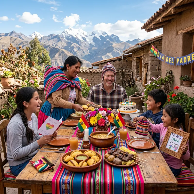 A traditional Father's Day celebration in Bolivia, showcasing the cultural richness and diversity of the nation. The scene includes a family of mixed descent (Caucasian father and Hispanic mother) with their children, sharing a meal at a festively decorated, rustic table. Bolivian traditional dishes such as salteñas and Anticuchos are in view, along with a cake for dessert. The ambiance is warm and joyful, with the backdrop of the stunning Bolivian Andes. Handmade gifts, typical of the occasion, are also present, reflecting deep family love and respect for the father.