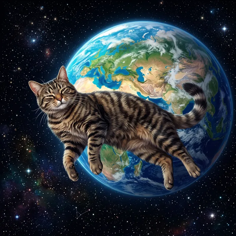 Create a digital illustration of a fauna and planet scene. In this scene, depict a medium-sized domestic feline with distinct stripes of tabby cats. The cat should be lazing, sprawled out comfortably yet suspending in zero gravity. In the background, display the planet Earth in a realistic style. The Earth should be cloaked in mesmerizing blues and greens representing oceans and land, and white clouds scattered across its surface. Set the scene in the cosmos - a black background interspersed with shimmering stars.