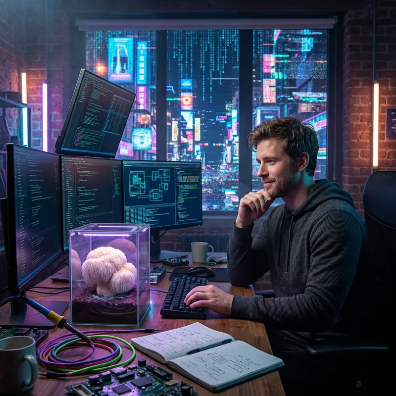 Depict a digitally distorted landscape lit by flickering neon lights. In this setting, a white man of athletic build is facing a complex task, sitting contemplatively yet with a slight smile on his face in front of a computer. He is poised for success, and next to him grows a Lion's Mane mushroom, assisting him in solving complex tasks.