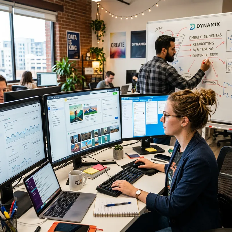 A Caucasian female digital marketer intensely absorbed in creating compelling social media ads on her high-tech computer. Her screen reflects a variety of engaging ad designs. On her desk are multiple screens displaying analytics and tracking data. A Hispanic male colleague in the background is brainstorming and illustrating ideas on a whiteboard. The room has a creative and vibrant atmosphere.