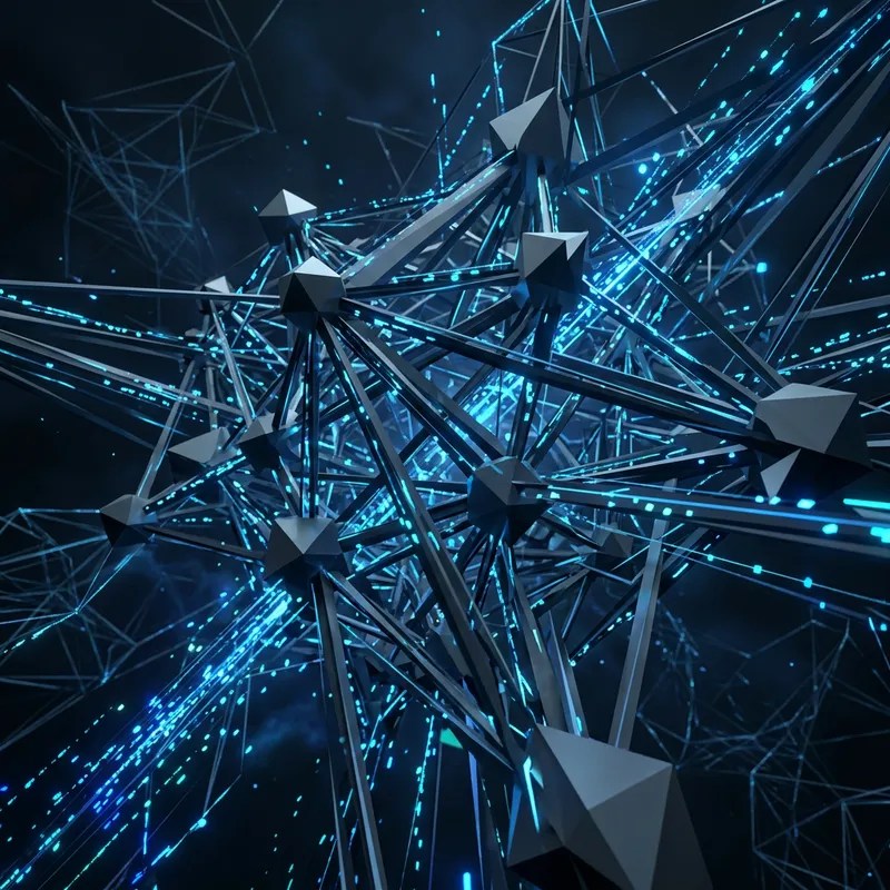 Visualize an abstract concept of the Internet network represented as an array of interconnected nodes, each reflecting digital signals. The overall form dominates the composition, comprising angular architecture with a multitude of sharp edges and intersecting lines. Illuminated data points flit along the network, symbolizing data transfer while vibrant hues of blue during the digital transmission contrast with the darker, matte finish of the angular network structure.