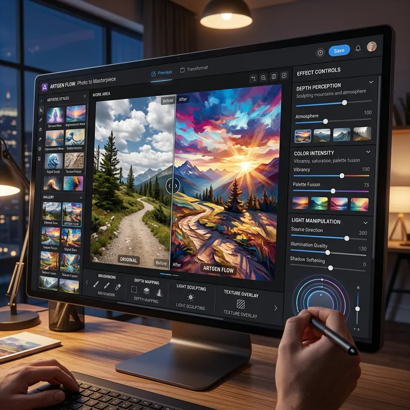 Imagine a digital tool that lets you convert standard pictures into extraordinary works of art. This platform uses modern technology to play with depth, intensity of color, and manipulation of light. It brings brilliance and artistic elegance to simple photographs, allowing for endless possibilities in the exploration of color, light, and texture. In the foreground, incorporate visual cues like an attractive user interface of the platform, displaying transformation of a common landscape photo into masterpiece, showcasing the intricate manipulation of colors, textures, and light.