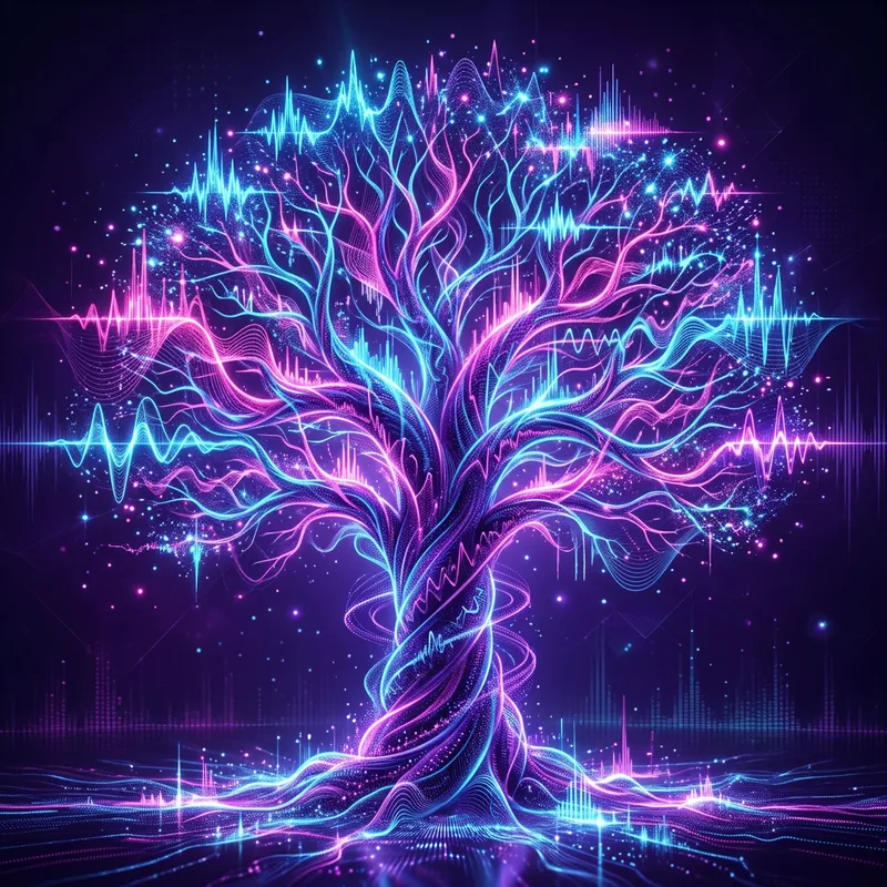 Digital tree made with sound waves and vibrations, blue, pink and dark purple
