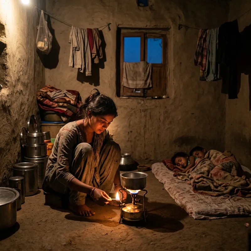 Dimly lit, cramped one-room home. Rina lights a small stove, her kids sleep on a mat.