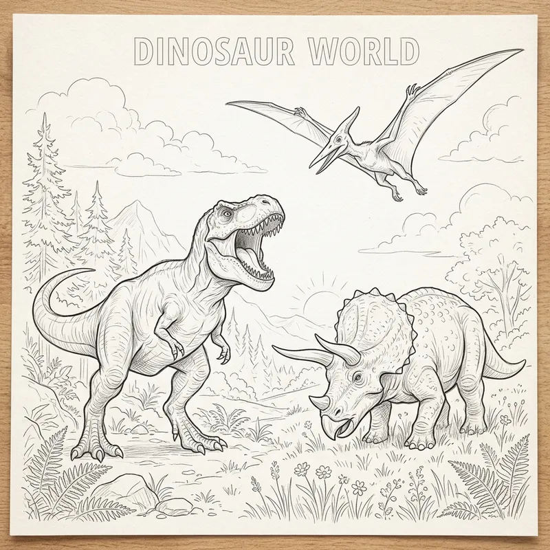 Various types of dinosaurs sketched out lightly, arranged on a single sheet to form a coloring page. Include a T-rex standing near a forested area, a Triceratops grazing in a meadow under the sun, and a Pterodactyl soaring high in a sky scattered with clouds. Each dinosaur has clear identifiable features and is represented in an exciting posture. The T-rex roaring with its huge jaws wide open, Triceratops peaceful yet imposing with large horns, and Pterodactyl in full flight with wings extended. The background should be faint enough to allow for personal creativity when coloring.