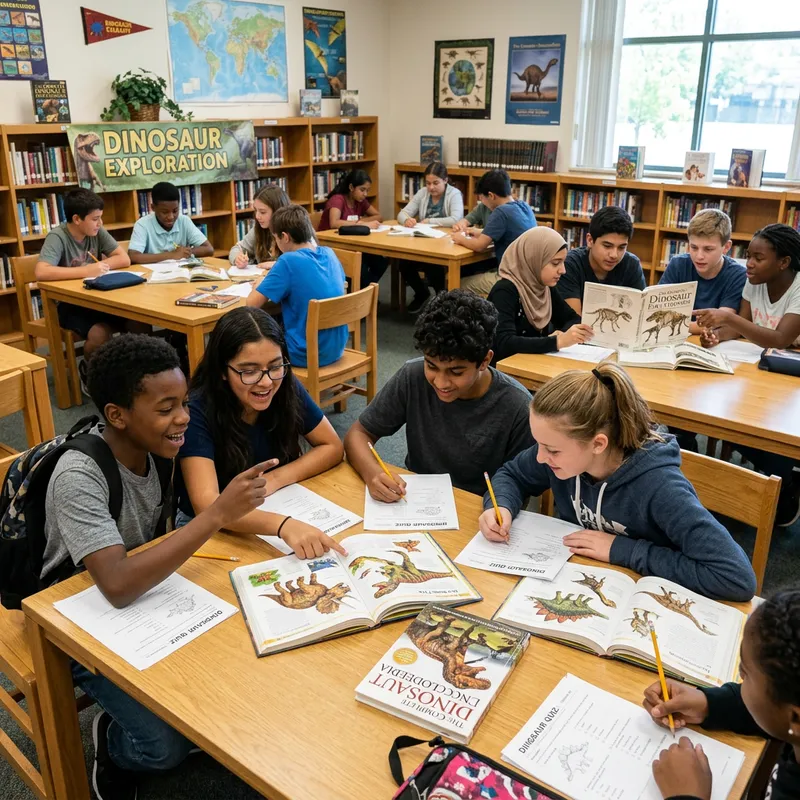 A diverse group of boys and girls aged 12 to 14 are enthusiastically engaged in taking a dinosaur test. They are seated in an amiable setting, say a classroom or a library. Some are huddled in small groups discussing their answers. Few are absorbed in analyzing diagrams of prehistoric creatures in their reference materials. South Asian, Middle Eastern, Black, Hispanic, and Caucasian children can be seen evenly spread. The focus of their eyes and their concentrated expressions suggest that this exercise is a thrilling journey for them back into the era of these magnificent creatures.