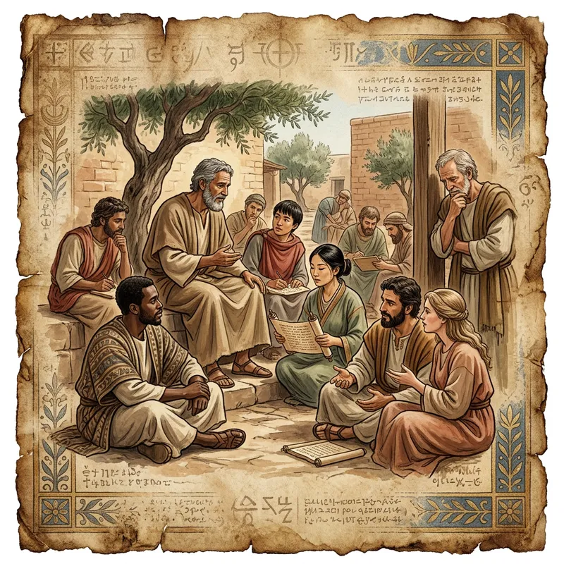 Imagine a scene that depicts discipleship during ancient times. Visualize an aged parchment as the backdrop, its edges frayed with time, and its surface adorned with various symbols and writings. On this parchment, there are depictions of people - male and female, of different descents such as Caucasian, Asian, Black, and Middle-Eastern. They are involved in various acts that portray learning and following - sitting at the feet of a teacher, reading texts, engaging in thoughtful discussions, and listening attentively. The teacher, a wise individual of unknown descent, is depicted as partaking in these activities with a sense of humility and respect.