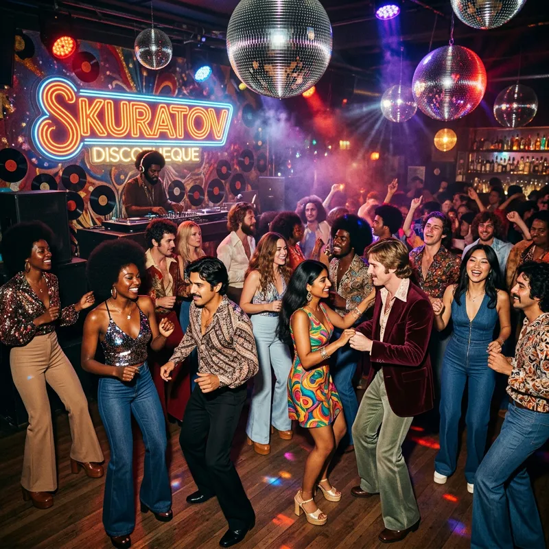 A lively disco party scene from the 1970s. Glittering mirror balls are reflecting colourful lights all around an energetic dancefloor. Retro attired people of various descents such as South Asian, Caucasian, Hispanic, and Black, both men and women, are energetically dancing to the beat of groovy music. Prominently displayed within the scene is the inscription 'Skuratov', perhaps elegantly styled in neon lights or boldly designed on a wall.