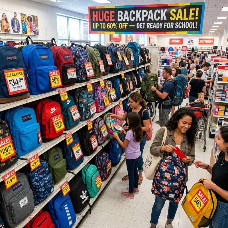 A detailed picture of a shopping scene: various backpacks and school bags on display, all adorned with vibrant price reduction tags symbolizing recent sales discounts. Shelves are neatly arranged with these bags of different sizes, designs, and colors in a well-lit retail store. A sale sign hangs prominently in the store, announcing the discount on these items. There's a clear sense of excitement for ongoing deals and hustle-bustle of shoppers keen on availing these offers.