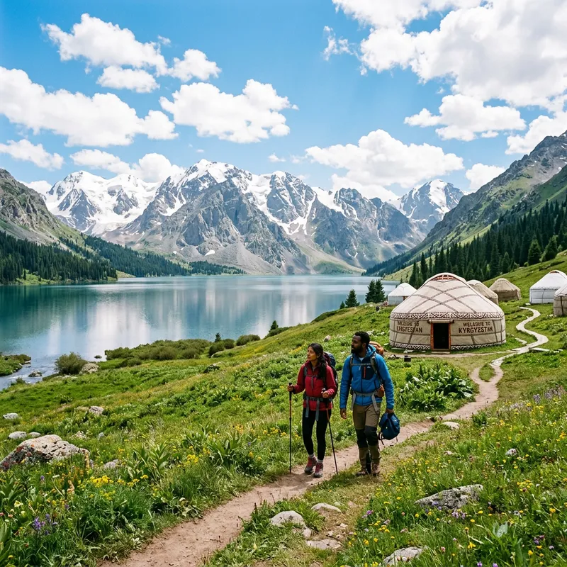 A picturesque view of the Kyrgyzstan countryside showcasing the abundant natural beauty. Imagine a serene lake with crystal clear water, nestled amidst towering mountains with snow-capped peaks. In the foreground, a well-worn hiking trail winds through a verdant green meadow, leading up to a traditional yurt set up for welcoming tourists. A couple of visitors, one a South Asian female and the other a Black male, are seen exploring the terrain, equipped with backpacks and hiking gear. The sky above is a brilliant blue, with fluffy white clouds dotting the expanse, making it an idyllic scene representing Kyrgyz tourism.