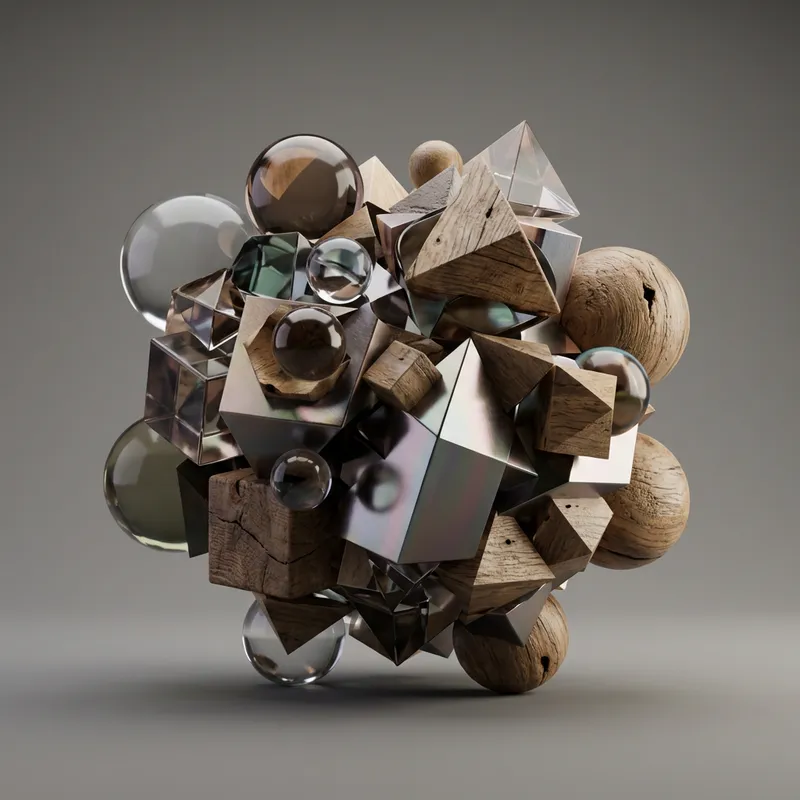 An abstract concept named 'Shpalognomik' visualized as an intricate and complex object made from geometric shapes such as spheres, cubes, and pyramids. The object has a variety of textures representing different elements, with parts made of smooth glass, rough wood, and polished metal. It is illuminated by ambient lighting, casting a multitude of shadows and reflections. The backdrop is a uniformly shaded neutral surface to emphasize the complexity of the 'Shpalognomik'.