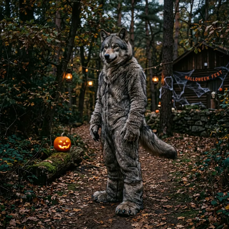 wolf costume made of fabric that looks like fur, very realistic with a Halloween theme and can be seen as a wolf without the theme.