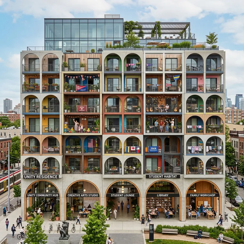 Create an image of a modular residential building designed for two distinct user groups: students and families. The building should allow for personal expression, enabling each unit to reflect the personality of its inhabitants and have its own unique identity. On the lower levels of the building, include a range of cultural communal spaces, which can be either public or semi-public, fostering a sense of community. At the very top, design a penthouse unit. The architecture of the building should be comprised of modular units, with distinctive arches incorporated into the design.
