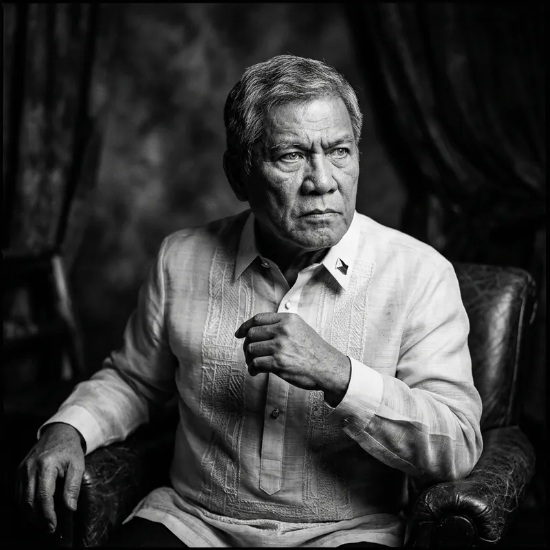 A dramatic portrait of a distinguished Filipino politician, depicted in the style of a high-contrast black and white photograph. The focus is on his powerful and determined facial expression. This is a studio portrait, taken with the equivalent of a high-quality digital SLR. The settings recall those of a Canon EOS 5D Mark IV, with an aperture of f/2.8 and using a 85mm lens. This image pays homage to the historical genre of political portraiture.