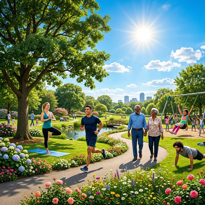 Create an image that depicts a peaceful, vibrant scene promoting beauty and health. There's a lush green park where individuals of various descents and genders are engaging in different activities. There's a Caucasian woman practicing yoga beneath a tree and a Hispanic man running on a jogging track. A South Asian child on the playground swings radiating happiness, while a Black elderly couple is seen leisurely walking hand-in-hand along a path. Nearby, a Middle-Eastern teenager is doing push-ups on the grass. The scene is filled with flowering plants, clear blue skies and a bright shining sun, perhaps symbolizing positive life energy.