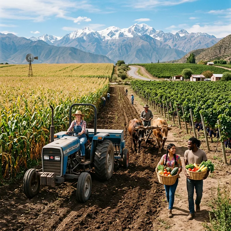 A sprawling agricultural landscape in South America with fertile soil. On one side, there's a field of tall, sun-kissed corn with a windmill in the distance. On the other side, vineyards spread out, their leaves a deep green and heavy with plump grapes. In the middle, a group of farmers toiling under the azure sky, sowing seeds. A Caucasian woman in a straw hat is confidently driving a tractor, while a Hispanic man is leading a team of oxen to plow the field. Nearby, a South Asian woman and a Black man are both carrying baskets filled with ripe, organic produce. In the background, the impressive Andes mountains stand tall, their snow-capped peaks touching the heavens.