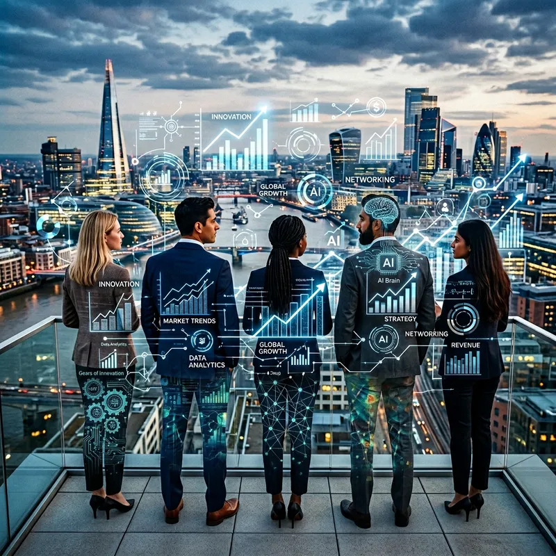 A double exposure composition depicting a group of business people with diverse backgrounds. The business group consists of a Caucasian woman, a Hispanic man, a Black woman, a Middle-Eastern man, and a South-Asian woman, all with their backs towards the viewer, standing in contemplation while gazing at a sprawling cityscape. Superimposed on this image are visuals of business charts, graphs, and various symbols of innovation, creating a complex layer of meaning and connection between the business individuals and the dynamics of the industry they are part of.