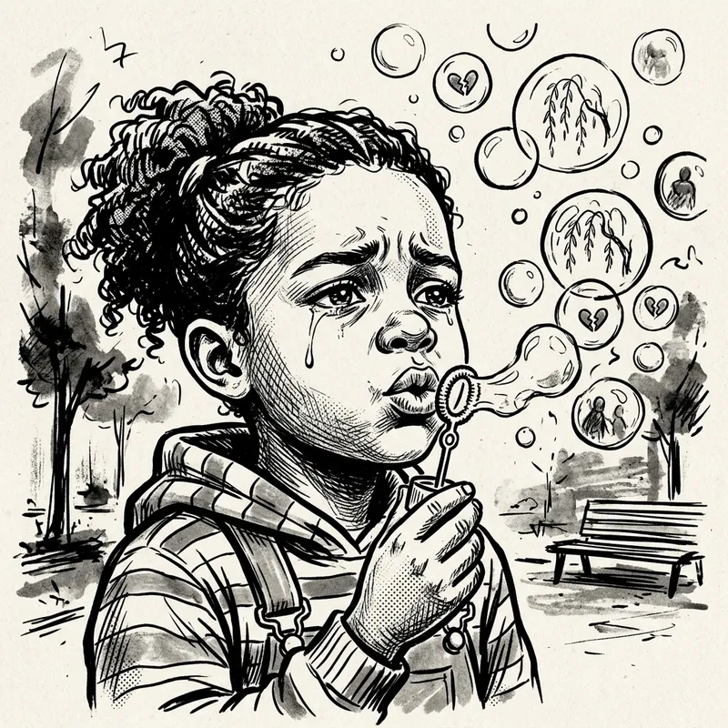 A monochrome, ink sketch-style illustration of a scene displaying a diverse child with exaggerated facial expressions showing grief and sorrow, in the midst of blowing bubbles with deep concentration. The image follows a high-contrast black and white format, with bold lines bringing out the form and emotions. The composition leans towards surrealism, with floating bubbles around, lending an air of a comic-inspired narrative while maintaining an aura of childlike innocence.