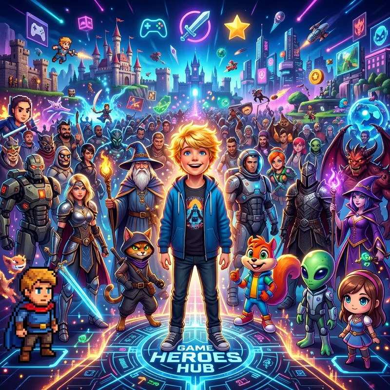 A multitude of computer game characters, with a blond boy standing centrally among them. The different characters come in various shapes, colors, and designs inspired by a variety of genres, demonstrating the rich diversity of computer games. The boy in the middle has a sunny blond hair, shining amidst all his digital companions.