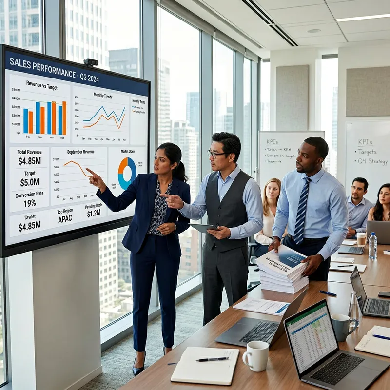 Diverse Corporate Professionals Sales Meeting with Digital Dashboard Insights