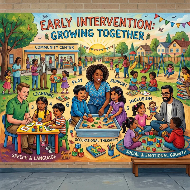 A large, vibrant wall mural depicting a scene of early intervention. The scene consists of numerous professionals engaging with children of different ages and genders in various learning and social activities. Several specialists, including a Caucasian male speech therapist, a Black female occupational therapist, and a Middle-Eastern adult psychologist, are seen interacting with the children. South Asian little girls and Hispanic boys are seen with learning tools and toys, enthusiastically participating in the activities. The atmosphere is filled with warmth, inclusivity, and a sense of communal growth.