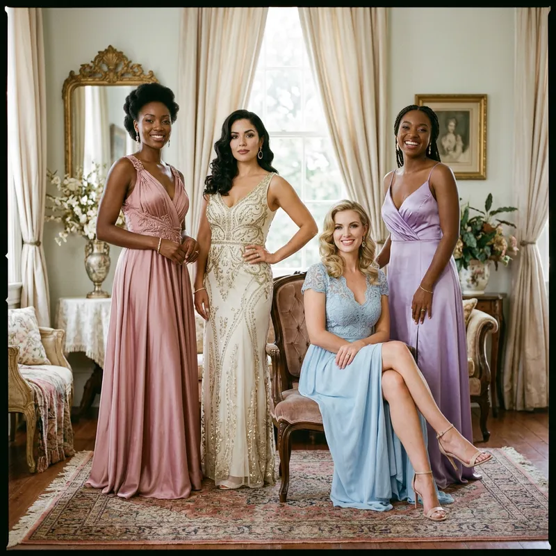 Create an image featuring a diverse group of elegant women from various descents such as Caucasian, Hispanic, and African. They are all dressed in glamorous attire, striking confident poses, and their expressions radiate self-assurance. The image is rendered with soft pastel color tones. It's conveyed through the lens of a medium format film camera to encapsulate a vintage, nostalgic aesthetic. The overall atmosphere of the image exudes the vibe of a fashion editorial.