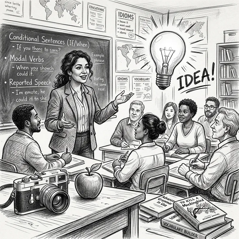 A black and white sketch of an eye-catching scene unfolds. A diverse group of individuals attentively learning English in a classroom setting. The teacher, a woman of Latina descent, is passionately imparting knowledge. On a table nearby, a vintage photography camera and a juicy apple are in the frame. Looming above them, within reach, is an enchanting display symbolizing an 'idea!' - perhaps a light bulb brightly illuminated. Books scattered around the area are giving a hint of advanced grammar topics being studied.