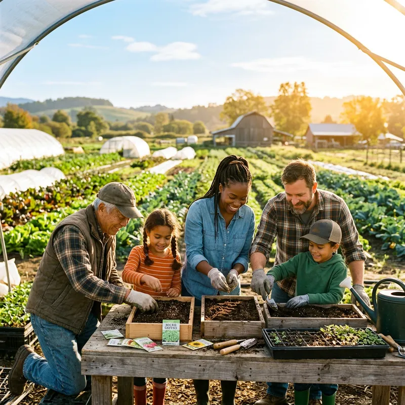 Multigenerational Family Seeding Micro Greens at Local Farm