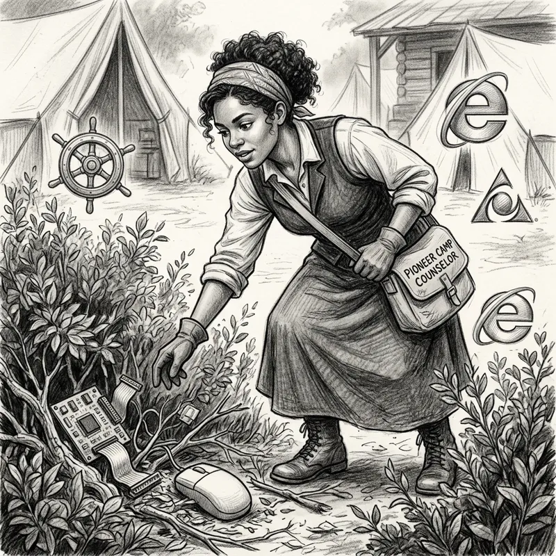Black and white pencil sketch presenting a diverse female pioneer counselor in a pioneer camp. She is curiously searching for something amidst the bushes. The central figure captures the attention, accented by scattered computer parts and distinct internet browser icons surrounding her. The overall atmosphere exudes nostalgia and adventure, embodying the quintessence of the pioneering spirit. Fine graphite pencil details bring out rich textures, creating an alluring veil of exploration and mystery.