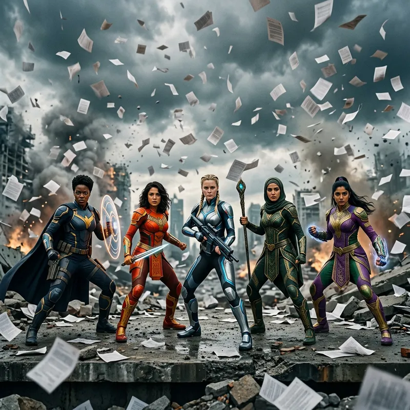 A hyperrealistic scene incorporating elements of cinematic photography portrays five female superheroes of varied descents such as Caucasian, Hispanic, Black, Middle-Eastern, and South Asian. They are each in unique costumes that are distinctive to their characters, standing in dynamic, ready-to-fight poses. The background overwhelms with an ambiance of chaos, illustrated by countless sheets of paper dramatically tumbling down from the sky.