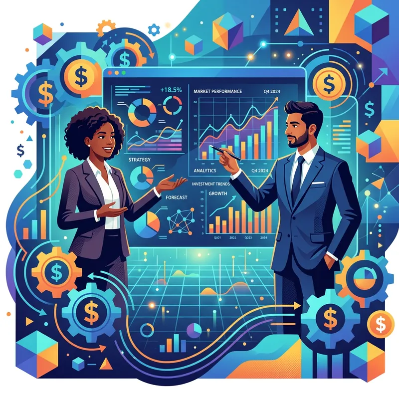 An abstract vector illustration of diverse individuals engaged in financial analysis. More specifically, it depicts a male analyst of South Asian descent and a female analyst of African descent, both dressed in formal business attire, presenting their findings on complex multi-colored charts and graphs, with abstract geometric shapes framing the scene. The visual metaphor of gears turning and dollar signs signifies the process of their analytical thinking and the financial context.
