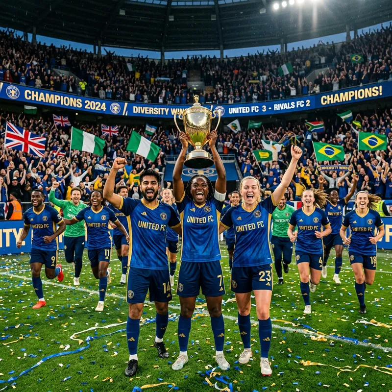 An iconic image of a football team celebrating after winning a championship. The team consists of players from different descents and genders, representing the diversity of football. In the foreground, three players jubilantly hoist a shimmering trophy high in the air, while teammates rush towards them in the background, their faces alight with joy and accomplishment. The pitch beneath their feet is a vibrant green, dotted with the confetti of their victory. The home ground stadium behind them is packed with people, fans waving flags in support and bursting with enthusiasm.