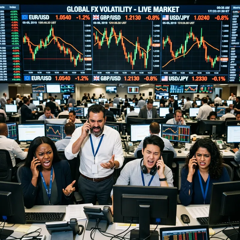 A diverse group of Forex dealers in New York, showcasing a broad mixture of genders and nationalities, are expressive in their displeasure while speaking to their clients on cellphones. They are stationed on a busy trading floor amidst the energetic atmosphere typical of such environments. A large digital monitor serves as an imposing backdrop, prominently displaying an intricate Forex chart, a dynamic landscape of peaks and troughs signifying the ever-fluctuating values of global currencies.