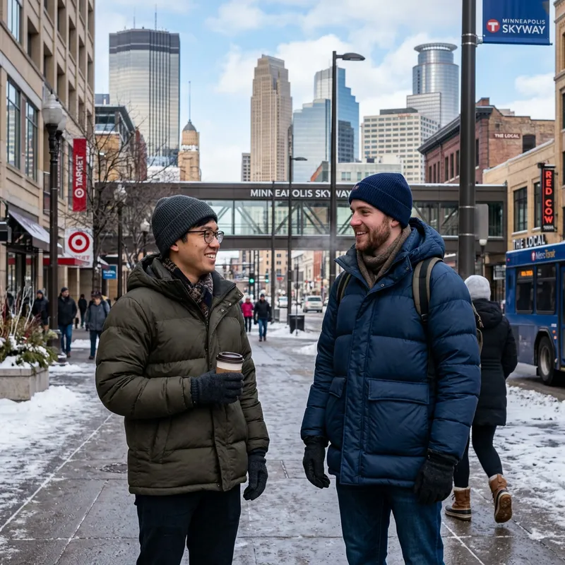 A Caucasian man and an East Asian man are seen in the urban setting of Minneapolis. Both are bundled up in warm clothing, specifically sporting down jackets to combat the chill of the city. Their jackets are puffing out as they stand tall, with the city's backdrop comprising of skyscrapers and local businesses behind them.