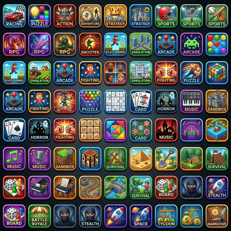 A collage of diverse game icons. Each icon is different, representing different game genres such as racing, puzzle, action, adventure, strategy, and sports. The icons have a variety of shapes, sizes, and colors, each uniquely designed to represent its respective game. The collage is arranged in a grid-like pattern, providing a visually pleasing overview of various games.