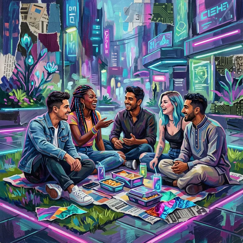 Cyberpunk Picnic: Diverse Group in Neon Park Atmosphere