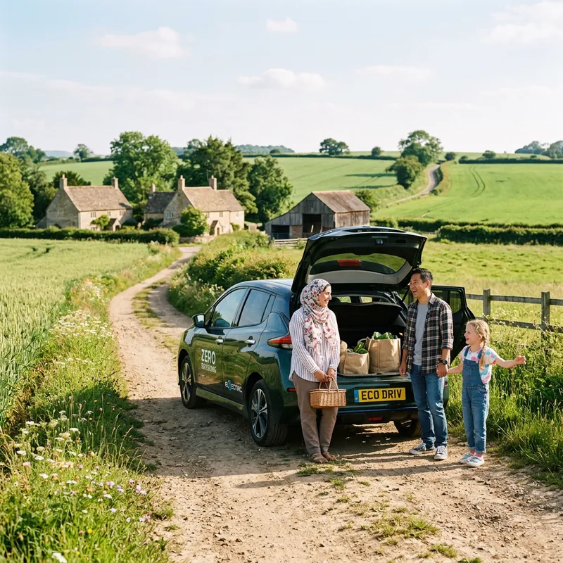 Photograph of a rural scene, showcasing environmental-friendly driving. A diverse group of people, including a Middle-Eastern woman, an East-Asian man, and a Caucasian child, can be seen using an eco-friendly car. The car is parked on a dirt road surrounded by lush green fields and traditional farmhouses. Sun is shining bright in the clear blue sky.