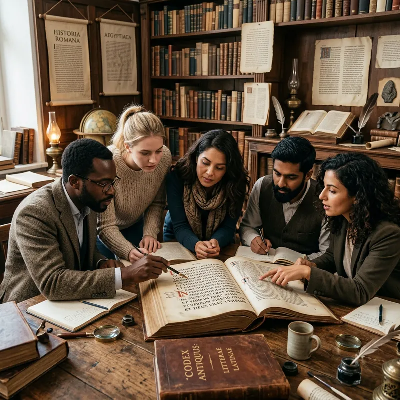 Illustrate an image of a diverse group of people, with individuals of varying descents such as Caucasian, Hispanic, Black, Middle-Eastern and South Asian, men and women alike, gathered around a hefty, ancient book. The book is open on a page exhibiting the Latin language script. Evocative of a study group setting, the people can be seen deeply engrossed in deciphering the script, with visible expressions of focus and intrigue. The room they're in is laden with historical artifacts and ancient scrolls contributing to the erudite ambiance.
