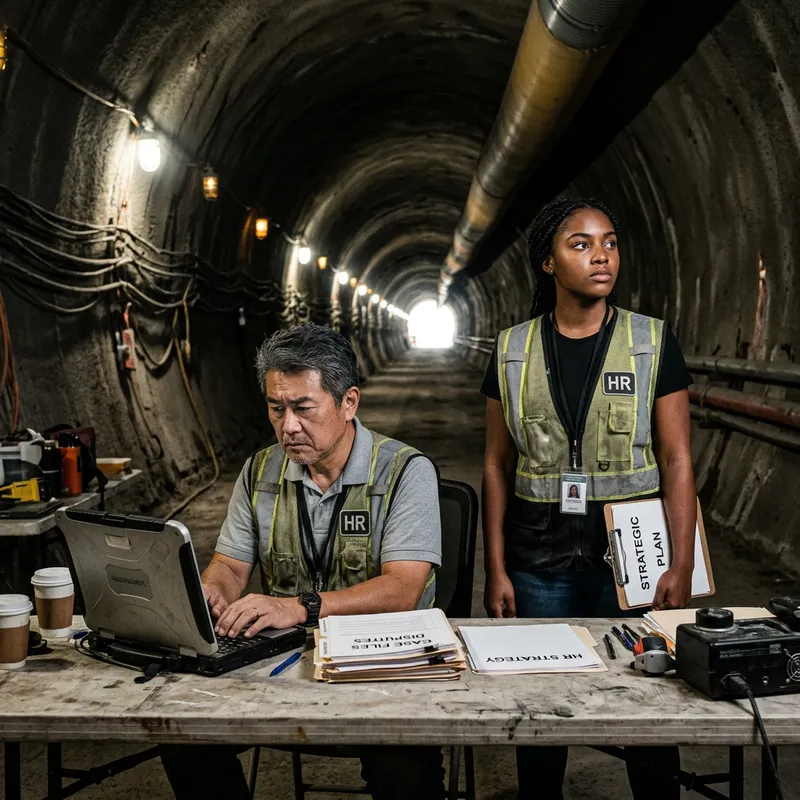 An intense photo of a diverse two-member Human Resources team working diligently in a tunnel. One is a middle-aged Asian man, looking stern and focused as he tackles a sea of problems. The other is a young African-American woman, showing fierce determination and resilience, her gaze fixated on the end of the tunnel, a metaphor for her goals. Despite the challenges encapsulating them, their body language radiates a strong will to survive, overcome hurdles and triumph in their tasks. Both are engaged in deciphering strategies to work against the odds and win their battles, projecting a palpable sense of ambition and a survivalist spirit.