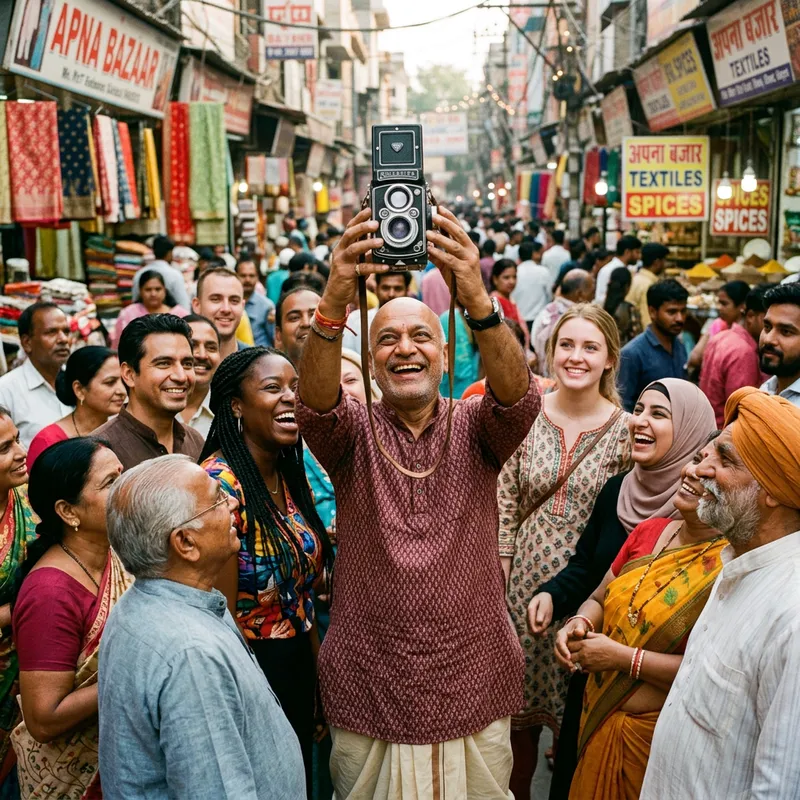 A mature, bald individual of South Asian descent, dressed in traditional Indian attire, is joyfully taking a selfie using a vintage camera. He is surrounded by a diverse crowd of Indian people consisting of both males and females of varying ages and descents such as Caucasian, Hispanic, Black, Middle-Eastern, South Asian and White. The background captures the vibrant and colorful atmosphere of a typical Indian market.
