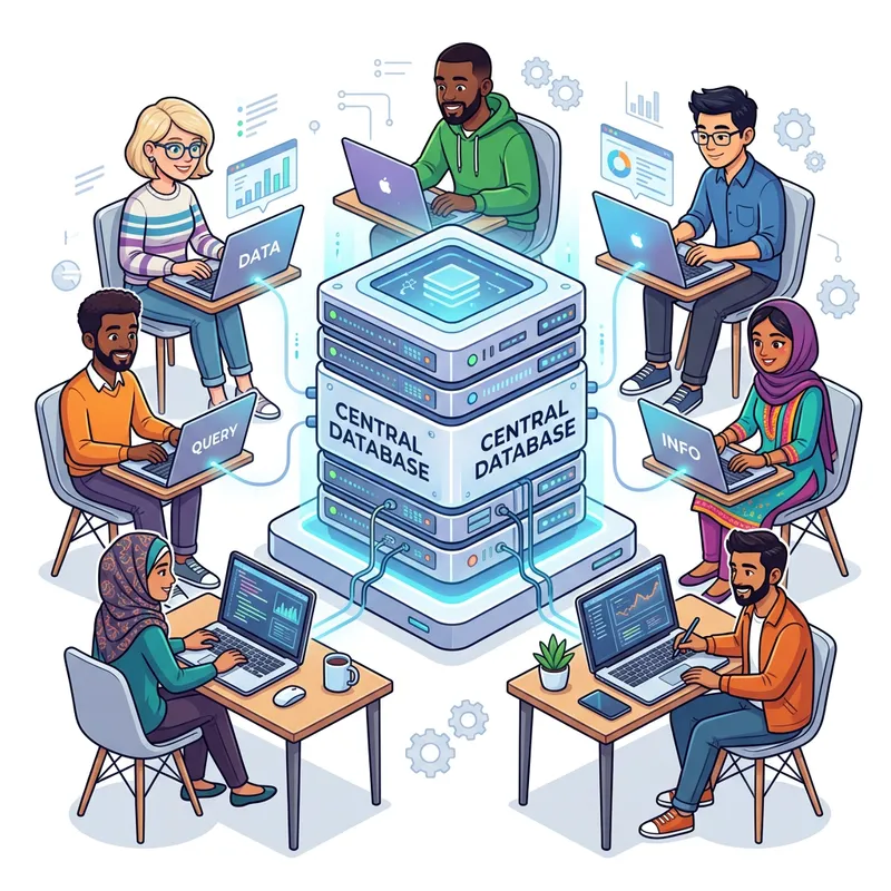 An illustrated scene showcasing a large database in the center of a group of diverse individuals. Each person, including Caucasian women, Black men, Hispanic men, Middle-Eastern women, South Asian women, and Asian men, is actively engaged with their laptops. The setting is simple and bright with a white background, displaying a crisp, clean and minimalist style in a cartoon representation.