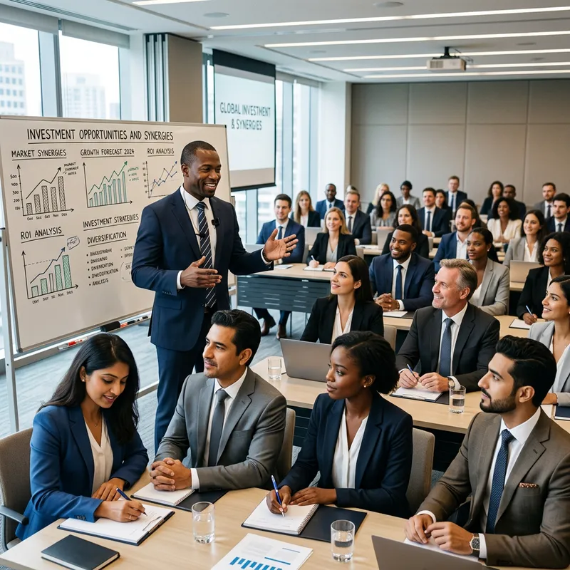 A business seminar on investment opportunities and synergies. Participants consisting of men and women of various descents including but not limited to Caucasian, Hispanic, Black, Middle-Eastern, and South Asian are in a conference room with a presenter at the front near a white board with charts and graphs. They're all dressed in formal business attire, attentively listening to the presenter who is passionately explaining the concepts, while some of them are taking notes. The room is well-lit, having a cheerful atmosphere encouraging learning and sharing of ideas.