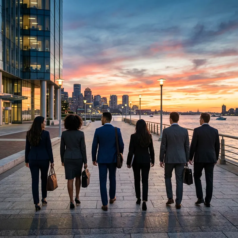 Diverse Multi-Ethnic Bankers Walking into the Sunset