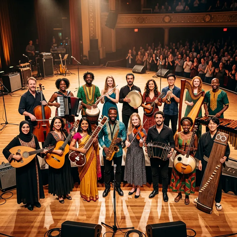 A musical group consisting of seventeen members. The members are evenly divided in terms of descent and gender. Each member is holding a different musical instrument, forming a diverse range of sounds representing different music genres.
