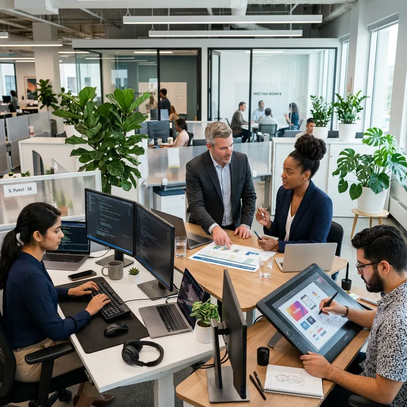 Create an image depicting a professional setting with a diverse group of employees. Picture a South Asian woman working as a software engineer, immersed in coding on her computer. A Caucasian man in a business suit is engaged in a conversation with a Black woman, both are project managers, discussing strategies over a printed spreadsheet on their table. An Hispanic man, who is a graphic designer, is absorbed in his creative process, sketching designs on a digital tablet. The office environment is modern, filled with glass partitioned cubicles, meeting rooms and indoor plants.